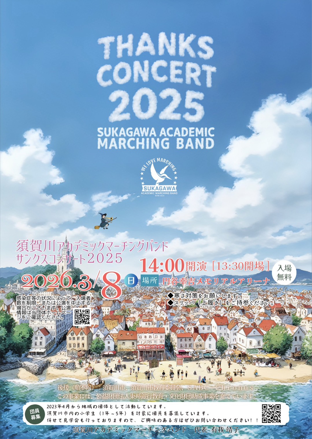 - 2026年3月8日(日)円谷幸吉メモリアルアリーナにて、サンクスコンサート開催いたします。13時30分開場、14時開演です。上履きのご持参と寒さ対策の上、お越しください。